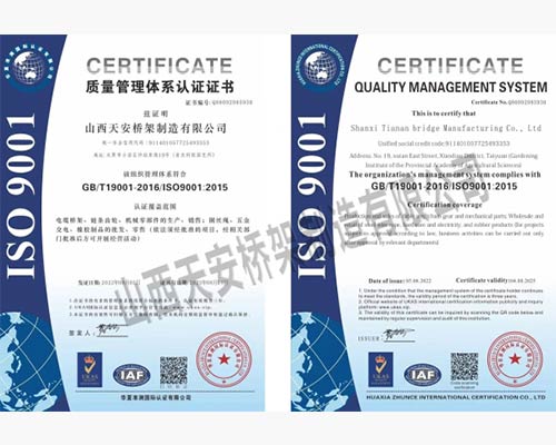 山西天安橋架制造有限公司是一家生產(chǎn)電纜橋架、母線槽的大型廠家,主要生產(chǎn):槽式橋架、托盤式橋架、梯級式橋架、大跨距橋架、母線槽有空氣型、密集型、耐火型、鋁合金等以及通風(fēng)管、可根據(jù)客戶要求定制各種型號各種規(guī)格,表面處理有熱鍍鋅、防火噴塑、防火漆、熱鍍鋅等,產(chǎn)品廣泛應(yīng)用于石油、化工、治金、電力、紡織、通訊、高層建筑等各個領(lǐng)域。產(chǎn)品具有外形美觀,耐腐蝕性強,安裝靈活方便,品種齊全等特點。